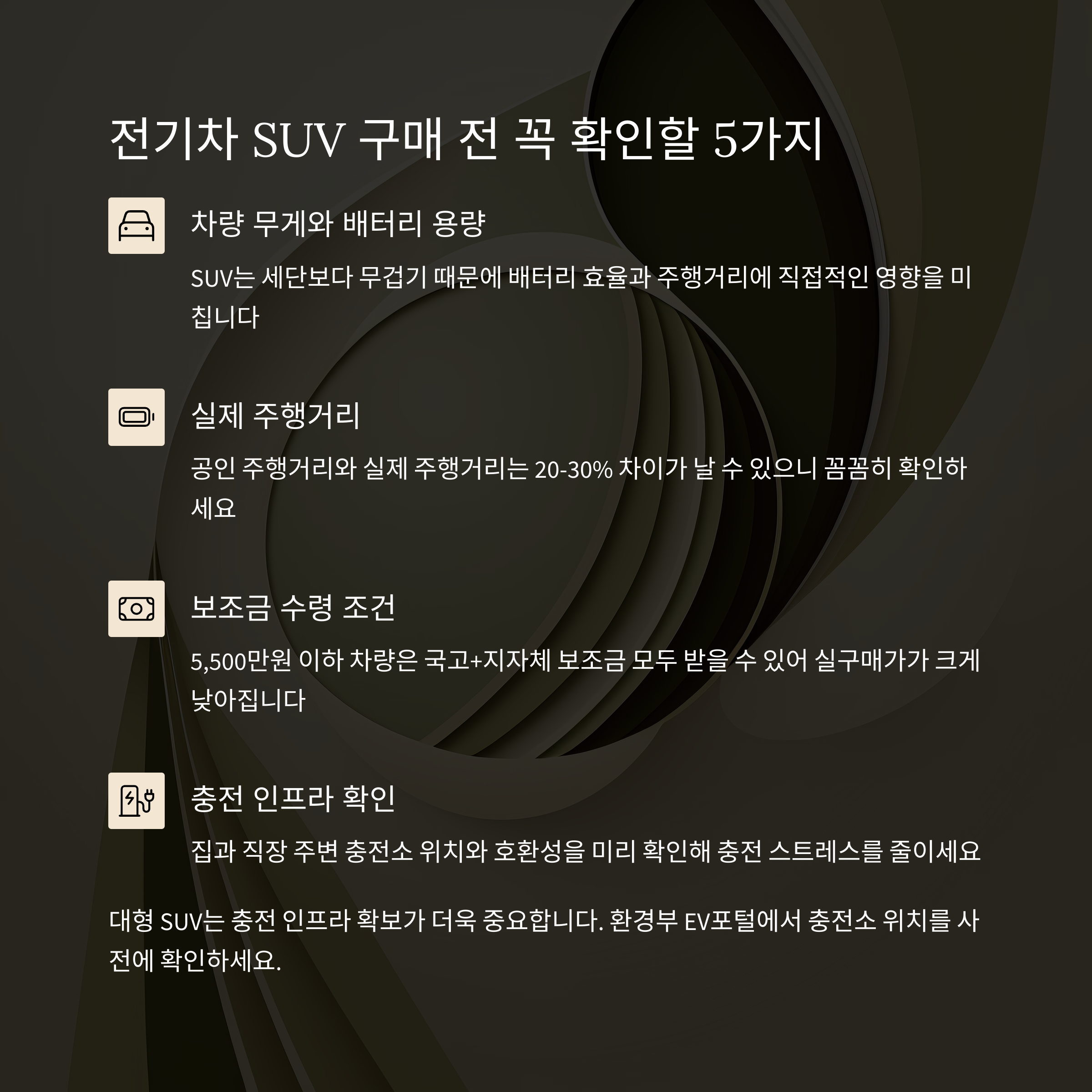 전기차 SUV를 고를 때는 일반 세단과 달리 차량 무게, 배터리 용량, 주행거리 소모량을 꼼꼼히 따져야 합니다.